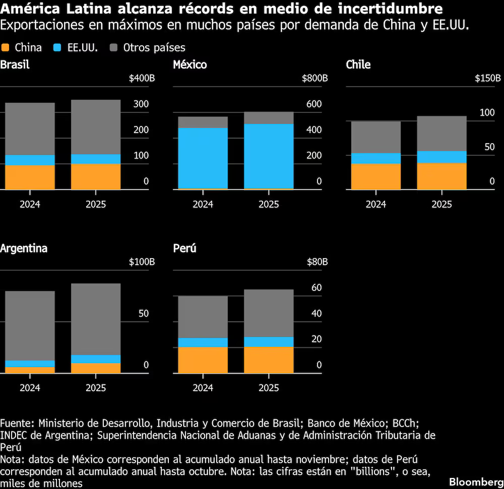 Argentina, Brazil and Chile recorded historic export figures in 2025, driven by demand from China and the region’s ability to redirect trade flows.