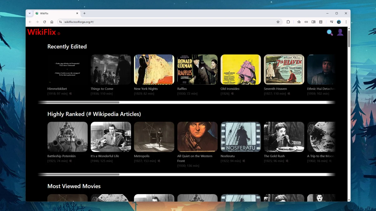 Hover over the main WikiFlix heading at the top of the page and a quick link to Movies by year pops up. This is a useful way of finding the most recent flicks added to WikiFlix, and digging back into the archive—not all of the movies here are in the public domain because their copyright has expired, and you will find more recent titles too.