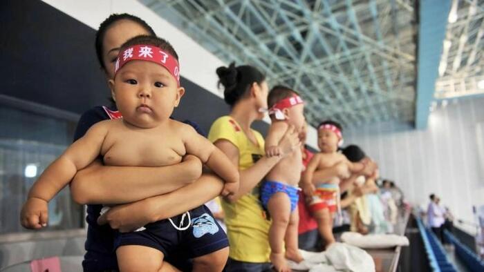 Increasing numbers of wealthy Chinese couples are hiring the services of American surrogate mothers to give birth to their babies to circumvent China’s one child policy. In the photo, hundreds of Chinese babies accompanied by their parents prepare to take part in a baby swimming contest. STR/Getty Images